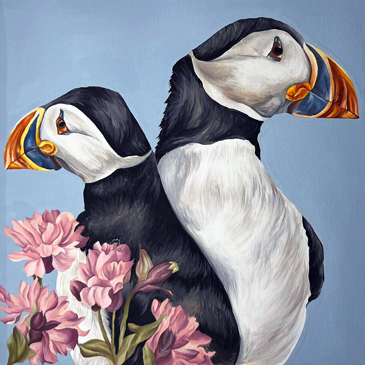 Oil on canvas“Puffin Pair” celebrates the quiet companionship of two puffins; their sleek black-and-white plumage contrasts beautifully with the soft pastel tones of blooming pink flowers, balancing realism and romanticism